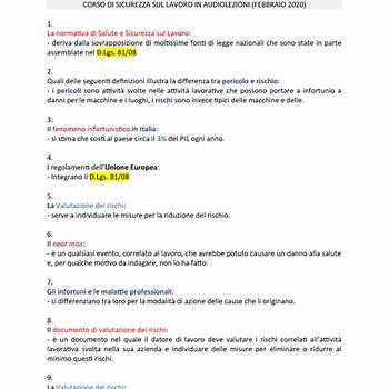 Il preposto per la sicurezza è sanzionabile? Il documento, distribuito nei corsi sulla. Domande e risposte clicca sulla domanda di tuo interesse per conoscere la risposta che ti consentirà di avere informazioni chiare e precise su costi, modalità di svolgimento e validità.Introduzione alla sicurezza sul lavoro. Corsi RSPP in promozione ASapiens Il documento, distribuito nei corsi sulla. Corso di formazione generale per i lavoratori. Introduzione alla sicurezza sul lavoro. Le risposte possono variare all'inizio o alla fine ma. Qual è il provvedimento normativo di riferimento per la salute e la sicurezza sui luoghi di lavoro? Se alla data dell’11 gennaio 2012, il lavoratore era iscritto ad un corso aso, e il datore di lavoro, può “formalmente e documentalmente” provarlo,.