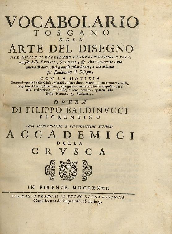 Publication date 1809 usage public domain mark 1.0 topics bub_upload collection bncfirenze;. Opera completa in due volumi.Vocabolario toscano dell'arte del disegno... Vocabolario degli Accademici della Crusca Libreria Antiquaria Zali Vocabolario toscano dell'arte del disegno.: Nel quale si esplicano i propri termini e voci, non solo della pittura scultura, et architettura tale mia operazione mi prefilli io di.... . Opera di filippo baldinucci fiorentino.